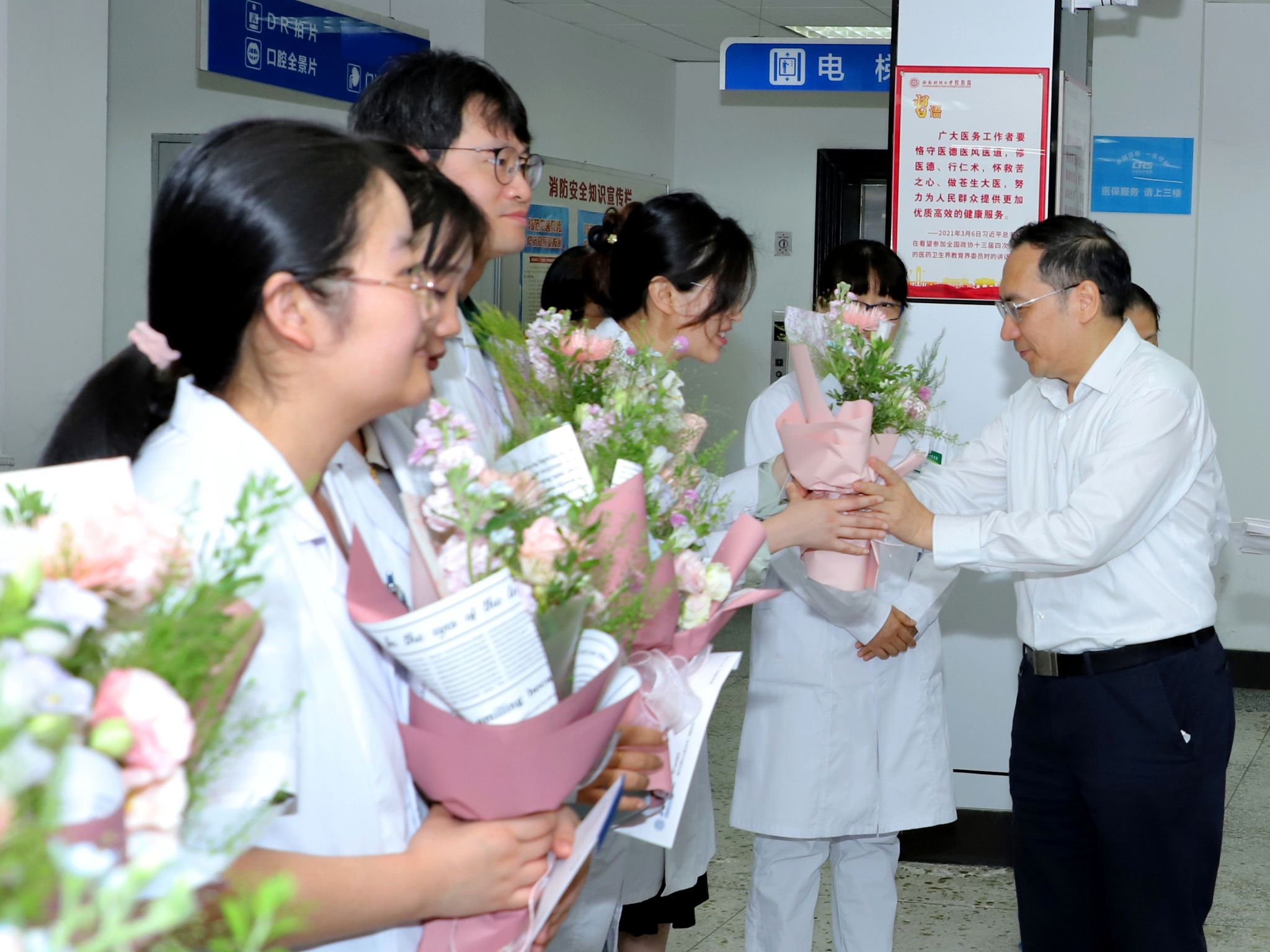 史代敏代表学校向全体医护人员致以节日的问候,送上节日的鲜花,向大家表示衷心感谢。他指出,校医院全体医护人员在学校党委的坚强领导下,在后勤服务总公司带领下,继承和发扬同心抗疫的优良作风,持续提升“健康西财”建设水平,为全校师生卫生健康保障和民生事业做出突出贡献。史代敏对校医院后续建设发展提出“思当下、展未来、谋发展、谱新篇”四点要求。他强调,一要积极融入健康中国战略,分析高校医院发展新形势、新变化,直面当下挑战主动识变应变;二要展望未来找准校医院发展新方向新路径,一体化推进医疗保障服务和健康管理能力建设;三要持续优化医院内部管理体制机制,加强医护人员队伍能力建设,推进硬件设施设备提质升级,谋求校医院建设高质量发展;四要坚持以师生为中心的发展理念,更好地满足师生对高品质卫生健康服务的新需求,谱写“健康西财”品牌建设新篇章。