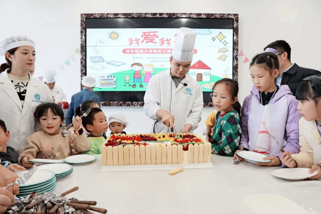 12 月 5 日下午,由西南财经大学校工会和女职工委员会联合举办的“我爱我家”教职工家庭烘焙活动如期举行。午后阳光洒进烹饪技能实训基地,参与的家庭陆续到来,在背景板前合影,笑容温暖。