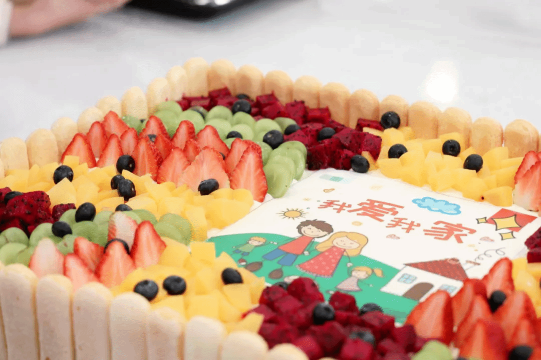 简短开场后,活动进入最令人期待的制作环节。长桌旁,孩子们踮起脚尖,眼睛亮品品地望向操作台。大手和小手一起协作——将糖粉、蛋液和面粉缓缓拌入黄油中。电动打蛋器低声嗡鸣,小朋友凑近观察食材慢慢融合。当面糊准备好,被细心装进裱花袋,孩子用小手认真扶着袋底,爸爸妈妈则轻柔地将面糊倒入。一个个饼干形状在烤盘上诞生,有的整齐,有的歪歪扭扭却满是天真,空气里漾开阵阵笑声。送入烤箱后,甜香渐渐弥漫开来。孩子们守在烤箱前,透过玻璃看着面糊一点点变成金黄酥脆的曲奇。在等待的空档,大家共同品尝了本次活动精心准备的“我爱我家”主题蛋糕。